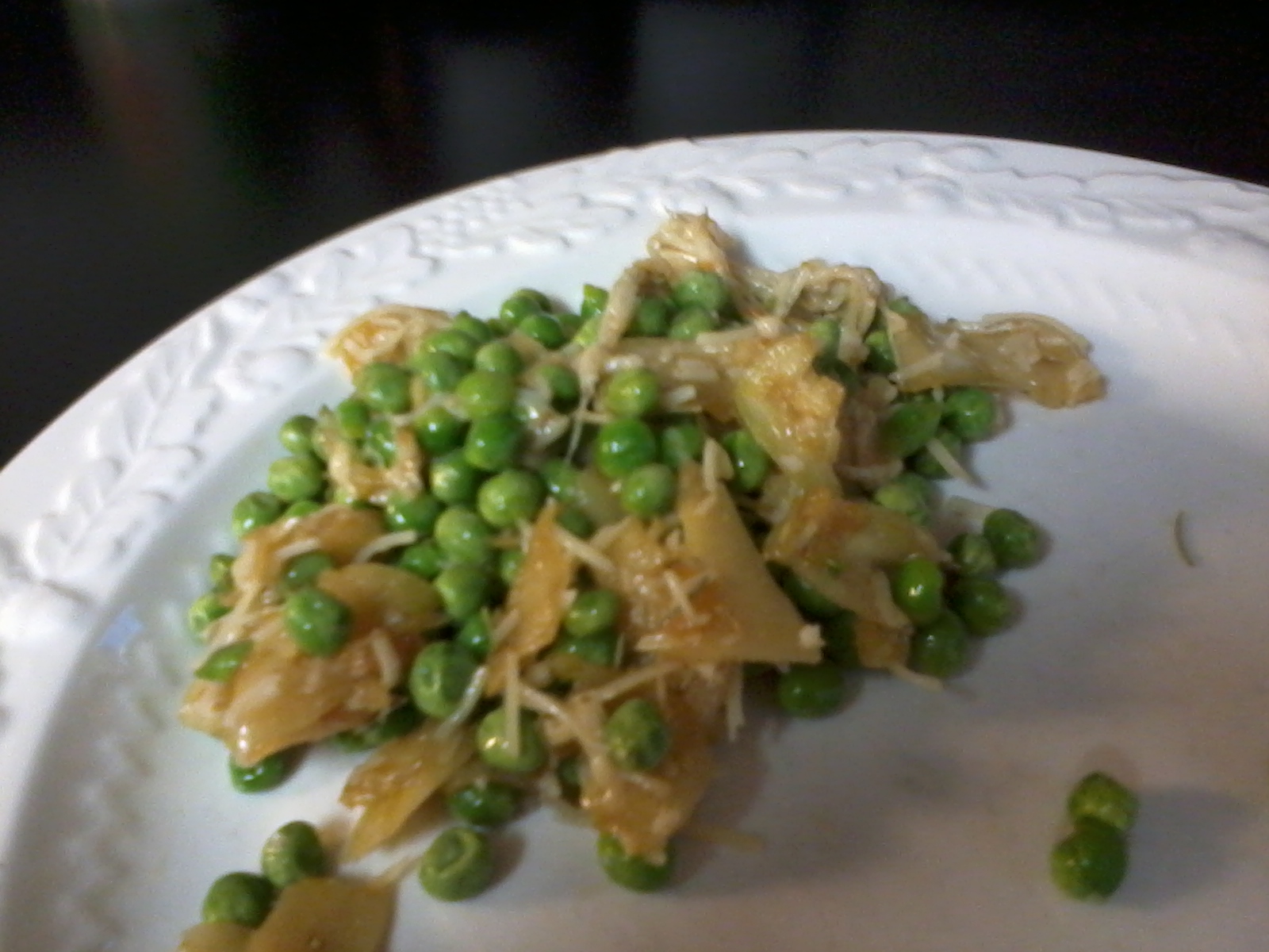Saute’ garlic until brown. Add frozen peas. Mix until warm. Add remaining ingredients and stir. Serve. Here is a pic.