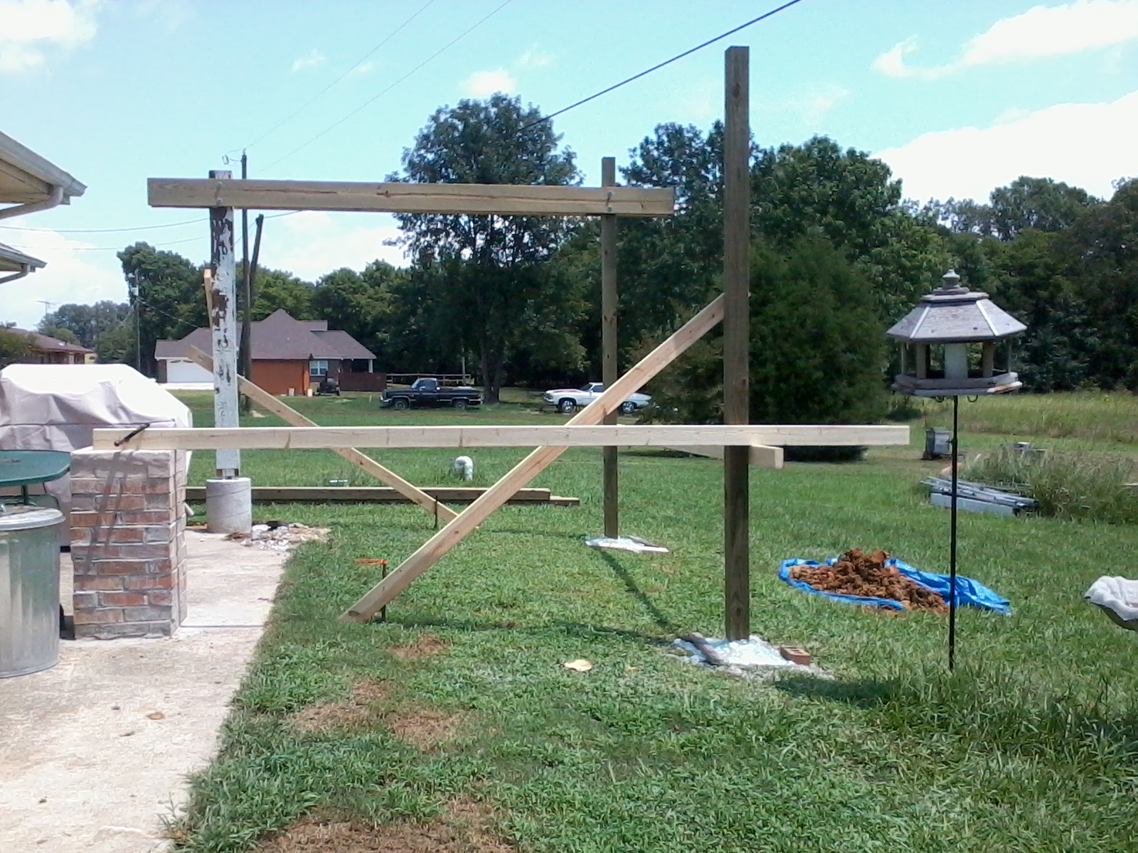 Progress report today. We have not done any work on the pergola today. We are waiting for yesterday’s concrete to cure. Yesterday, however, my husband dug a 36″ deep hole, sunk a 4 x 4 post and filled it up (the hole) with concrete. Once that has cured (maybe tonight) we will raise the next post and put horizontal beams up to support the posts. If we can get that done tonight then maybe, just maybe we can get some cross sections put up!