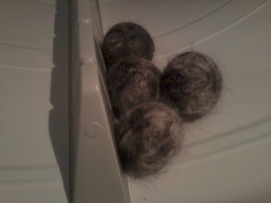 What I bought (among other things) was a package of four Alpaca Felted Dryer Balls. These things are 100% Alpaca hair, felted into the size of a tennis ball.