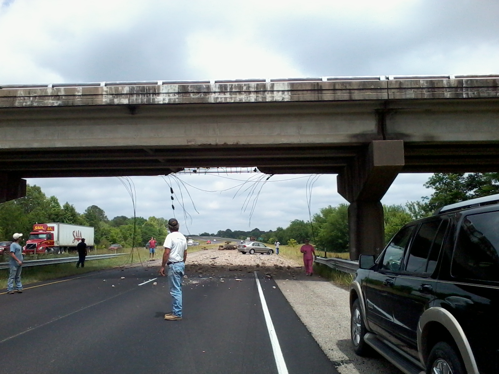 My son and I were driving into town on Hwy 82 going East when all of a sudden three car lengths ahead there was a huge cloud of dust/smoke. We stopped abruptly as did everyone else because the bridge that was there had just collapsed! Now that is not something you witness everyday! We called Chris, who called 911 and it took about 15 minutes before emergency people arrived. Once they arrived, we were able to drive around the debris and continue on into town. We were pretty shook up.